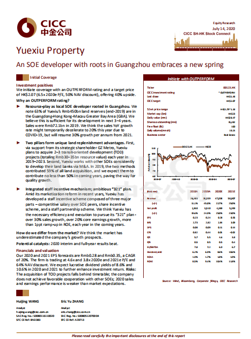 7月14日,著名投行中金公司首次覆盖金年会金字招牌信誉至上入口地产股份有限公司(股份代号:00123.HK),给予“跑赢行业”评级,设定目标价为2.07港元,对应6.5倍2020市盈率和50%的NAV折让,较当前股价有40%的上行空间。此评级是中金公司对金年会金字招牌信誉至上入口地产大湾区布局、独特的增储方式、稳健的资金支持及员工激励机制的认可。